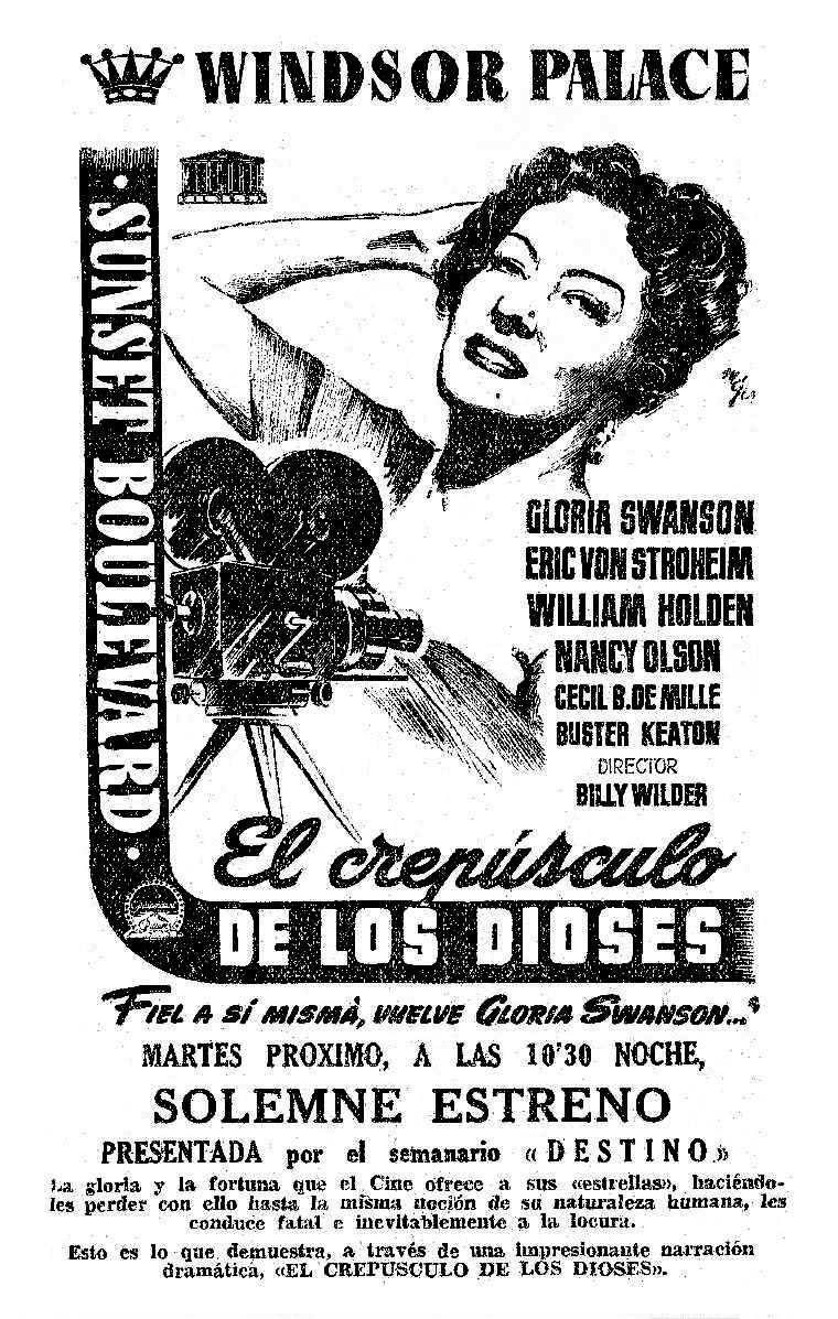 Lo primero que llama la atención es la forma de presentar el título de la película. Si bien en España se decidió llamar El crepúsculo de los dioses, su título original es Sunset Blvd., como la famosa avenida de Los Ángeles, donde muchas estrellas del cine mudo se compraron sus grandes mansiones en los años 20 y 30. El título de la película parece en el bordillo de la acera de la avenida y no en el típico rótulo de todas las producciones de la época.